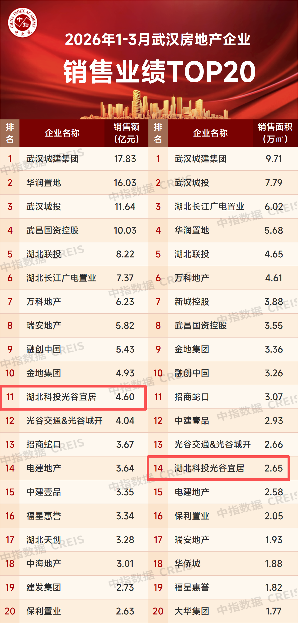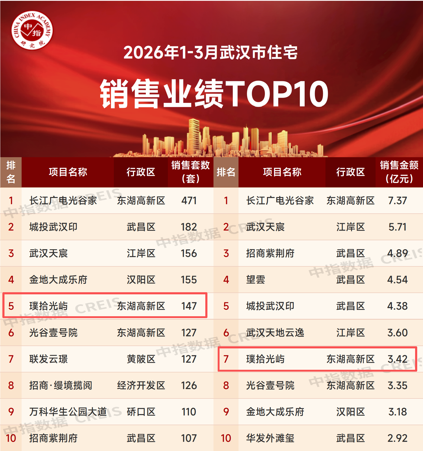 近日,中指研究院发布了《2026年1-3月武汉房地产企业销售业绩TOP20》榜单。在中指研究院榜单中,湖北科投旗下光谷宜居公司1-3月全口径销售面积、销售金额指标均位居前列;璞拾光屿作为今年入市新盘,去化表现不凡,在2026年1-3月武汉市住宅销售套数TOP10中排名第五,赢得广泛的市场与客户认可。